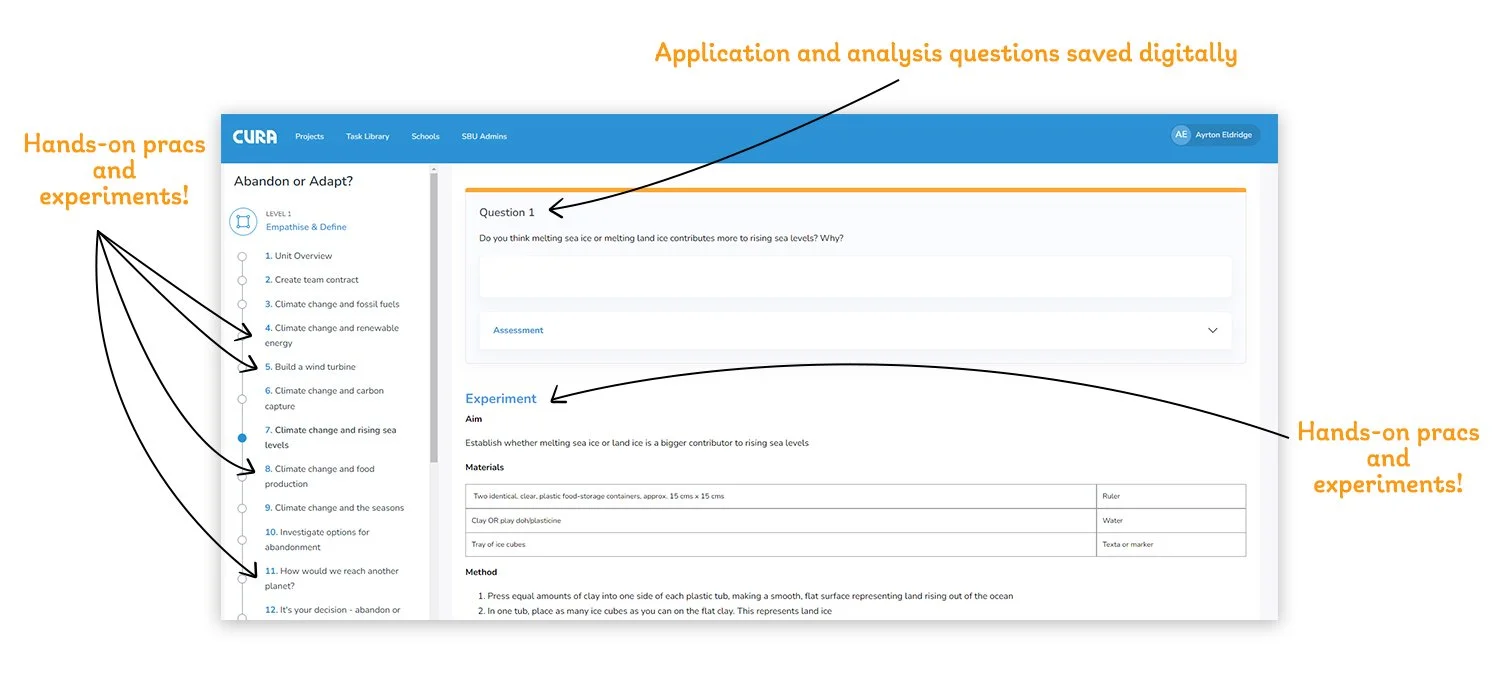 Cura’s PBL platform helps you manage the chaos. Everything you need for the unit is in one place. The curriculum is set out in an easy-to-follow workflow which students can navigate at their own pace. Student and teacher resources are at your fingertips. It makes planning each class a breeze.